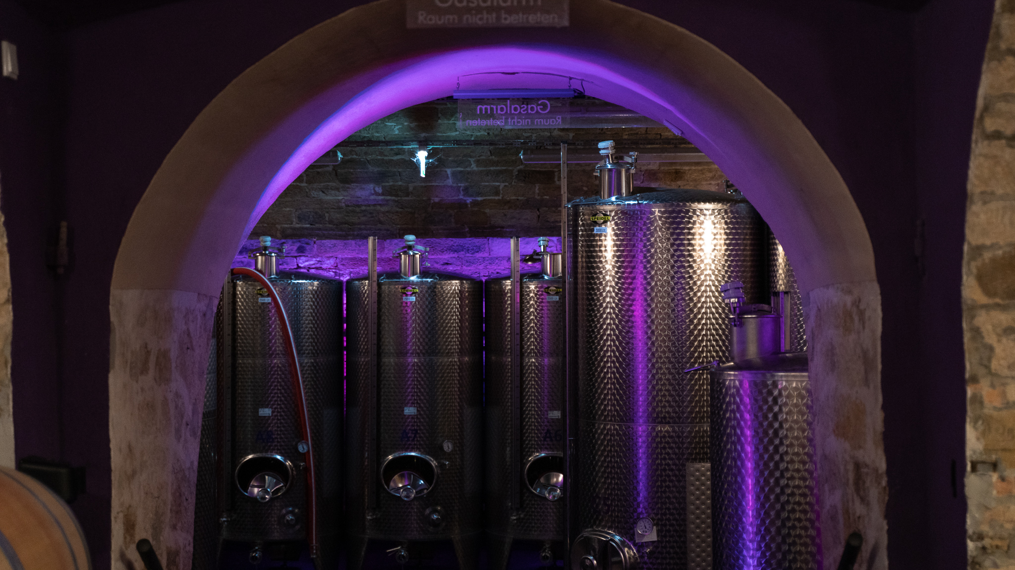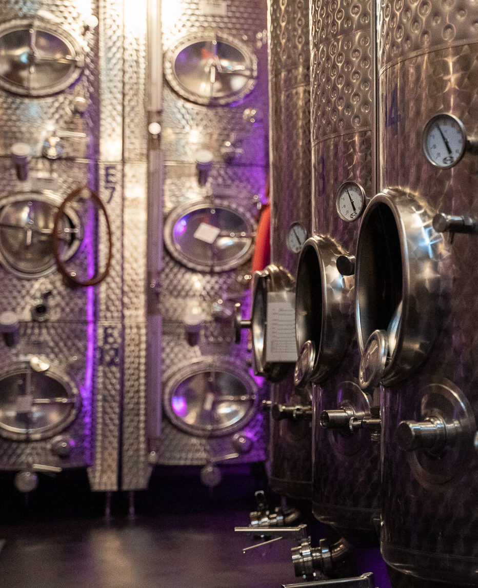 Das Ergebnis ist ein beeindruckender unterirdischer Komplex. Hier lagern unter anderem die kühlbaren Edelstahltanks mit einem Fassungsvermögen von insgesamt 350.000 Liter. Im oberen Keller liegen die Holzfässer, die sowohl für den Ausbau von Rotweinen, als auch für einen Teil der Weißweine verwendet werden.